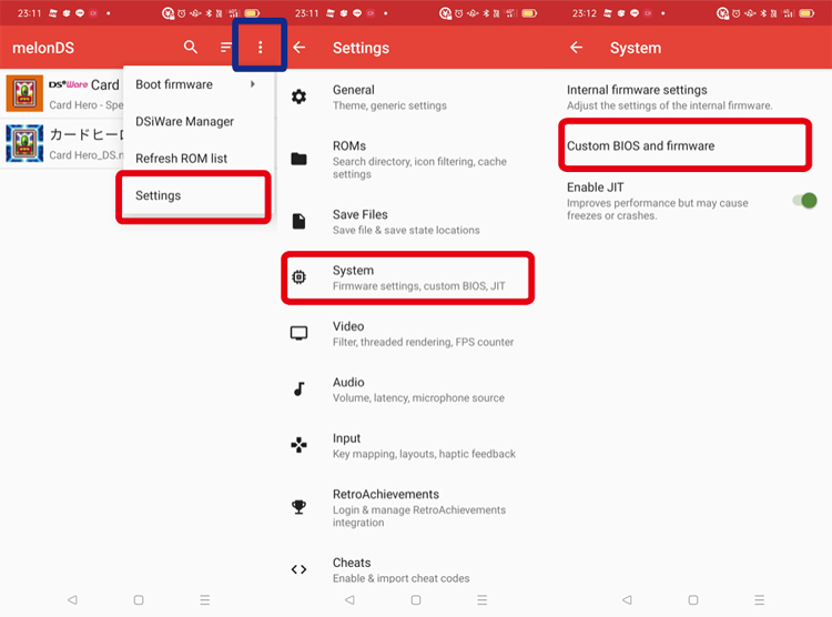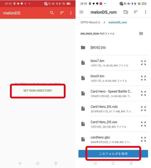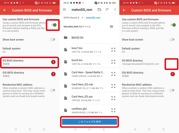 melonDSのAndroidアプリはパソコン版とは違い、バイオスやファームウェアのファイル名が固定で指定されています。