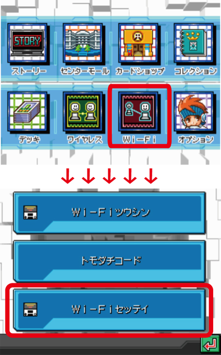 カードヒーローDSを起動して、メニューより「Wi-Fiセッテイ」を選びます。