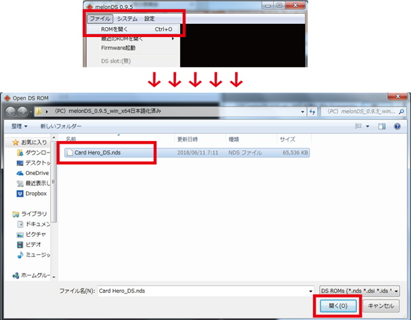 ・ファイル → ROMを開く → カードーヒーローのゲームROM(拡張子.nds)を選択 → 開くをクリック